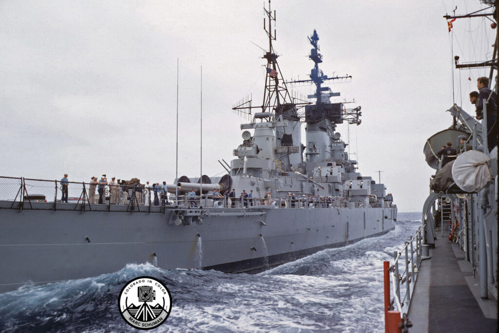 Coming Along Side USS New Jersey (BB-62) for an Underway Replenishment, Eastern Pacific Ocean, July, 1969. Every U.S. Navy sailor who goes to sea sooner or later witnesses an Underway Replenishment (UNREP), an evolution no other navy to this day has mastered as well as the U.S. Navy. A miracle of logistics, rigorous procedure, shipboard engineering and design and most of all skilled ship handling, vessels rendezvous a mere 150 to 200 feet apart, steer compensating parallel courses and identical speeds, and transfer personnel, fuel, dry stores, refrigerated stores, ammunition, spare parts, U.S. Mail, and in my time in the navy–movies! Other than flight operations at sea there are few routine evolutions that involve more risk for mishaps and less margin for error than underway replenishment operations. Seen here is the ship in which I served as a midshipman, USS Morton (DD-948), one of the last of the all gun destroyers, coming along side New Jersey for a fuel oil transfer. Morton was a 4200 ton, 418 foot long ship long ago scrapped. New Jersey, still in existence as a museum ship in Camden Yard, New Jersey is a 45,000 ton. 887 foot long battleship of the Iowa class–the largest battleships built for the U.S. Navy before aircraft carriers made 16″ naval guns obsolete. On this particular July day in relatively calm seas, New Jersey appeared as a castle of steel barely heaving or rolling as she made way, while Morton did the opposite to keep up, heaving and rolling, belying her relatively small tonnage, not even ten percent that of New Jersey. To witness New Jersey this close underway is an event no midshipman ever forgets. Certainly, my Rollei 35T 35mm camera, always in my khaki pants pocket, was kept busy recording this once-in-a-lifetime experience on Kodachrome 25 color slide film, perhaps the best color film ever made.