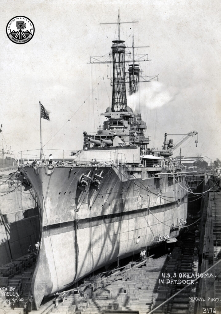 On December 7, 1941, Oklahoma was heavily damaged during the Japanese attack on Pearl Harbor, and it capsized and sank in the mud. It was eventually righted and refloated, but the navy determined that it could not be repaired. While being towed to the west coast for scrapping in 1947 it sank in a storm.