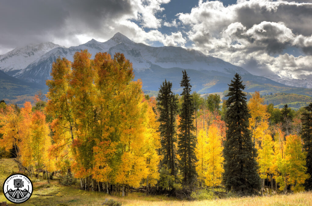 With benefit of a patchy cloud cover to block the sun where I stood, I was able to momentarily shoot in the sun’s direction to capture brilliantly backlit aspen trees with Wilson Peak as a backdrop in this scene south of Mountain Village near Telluride. I know of no more brilliant yellow in all of Colorado than a backlit aspen tree at the height of fall colors. The camera I used at the time, a Nikon D-810 equipped with a 24-70mm f2.8 ED Nikkor lens at 62mm was the highest resolution DSLR of its time, and a fine camera even today.