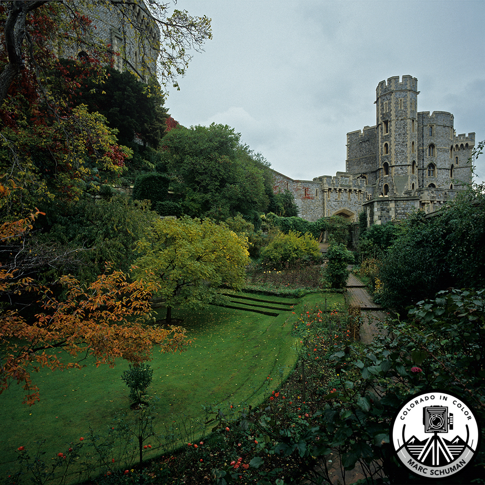 Stately Windsor Castle in late fall showing a single crenulated turret and surrounding grounds. Built in the eleventh century by William the Conqueror, it is the largest inhabited castle in the world. Taken with a Hasselblad Superwide Camera equipped with a 38mm f4.5 Carl Zeiss Biogon lens on medium format Kodak Ektachrome film, a high resolution scan of the original transparency yields excellent inkjet color prints