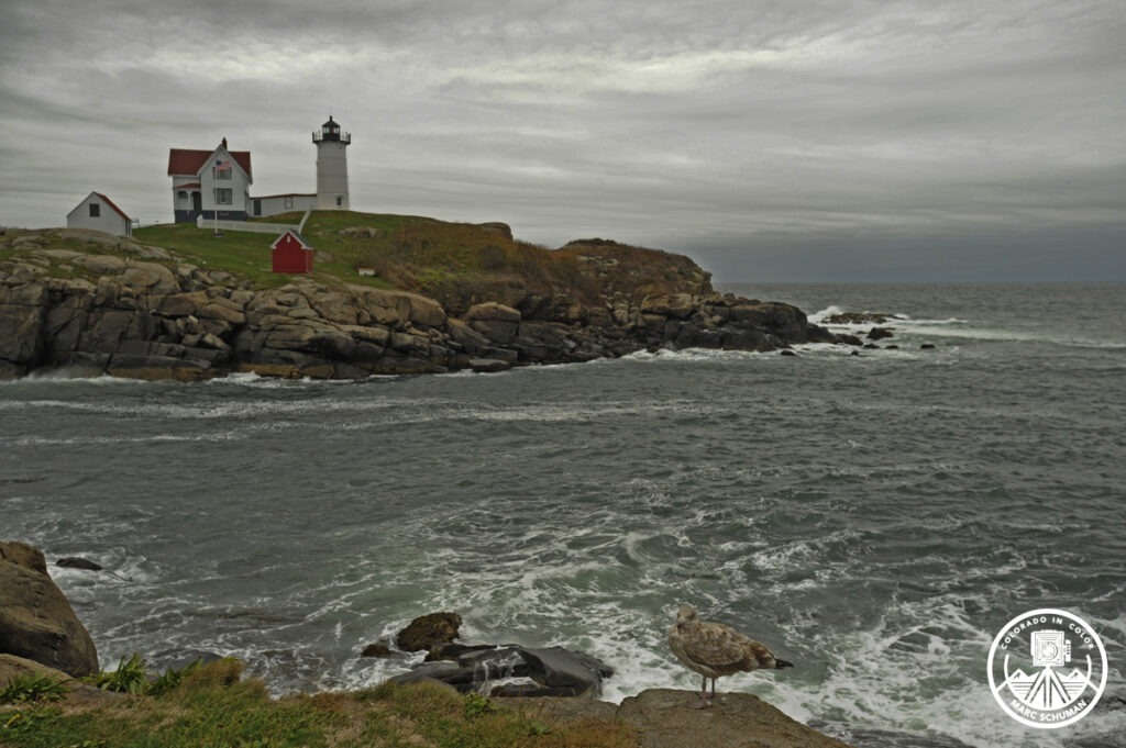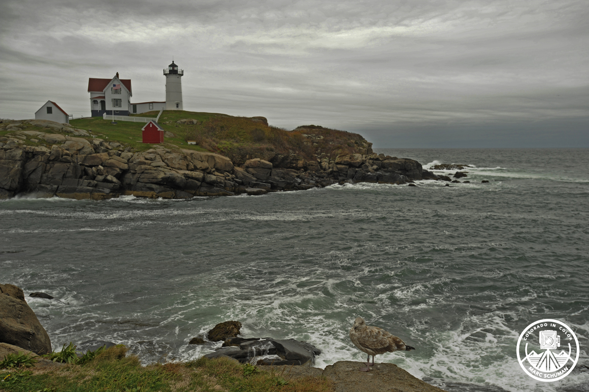 Taken with a Nikon D700 equipped with a 17-35mm f2.8 ED AF Nikkor Zoom lens at 32mm, the Cape Neddick Nubble Light on the south east Maine coast at York is a must-see for photographers. Apparently the bird at lower right was interested in a hand-out from me this chilly and windy October morning, but I was “focused” on other things, as this was the only day I was able to be at this venue on my trip to New England.