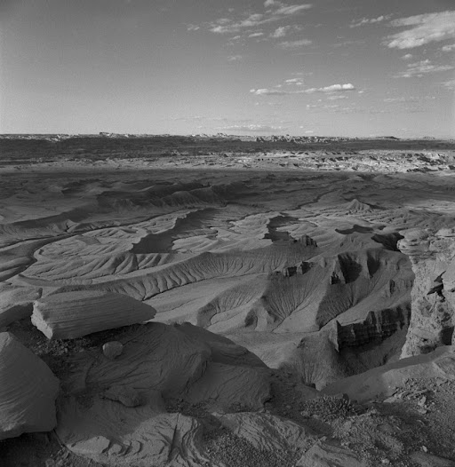 Black-and-white removes distraction. No color, no clutter—just form, texture, light, and the overwhelming sense of space. With larger film formats, every nuance is preserved: the way light bleeds over a sandstone ledge or the grain in distant brush under overcast skies.